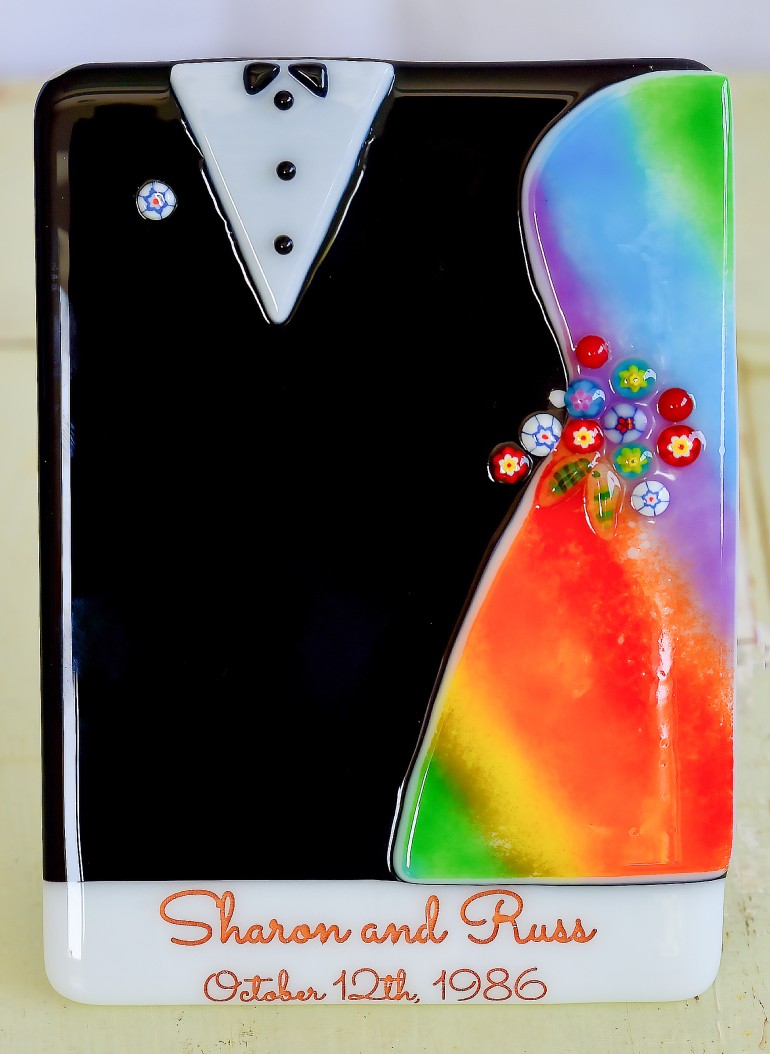 For those who enjoy the fun and funky side of glass art, we love the possibilities found in these illustration-style bride and groom impressions, fully customizable to include a couple’s wedding colors, flowers, names, and dates. These are a fabulous option for a couple looking to commemorate their wedding day!
