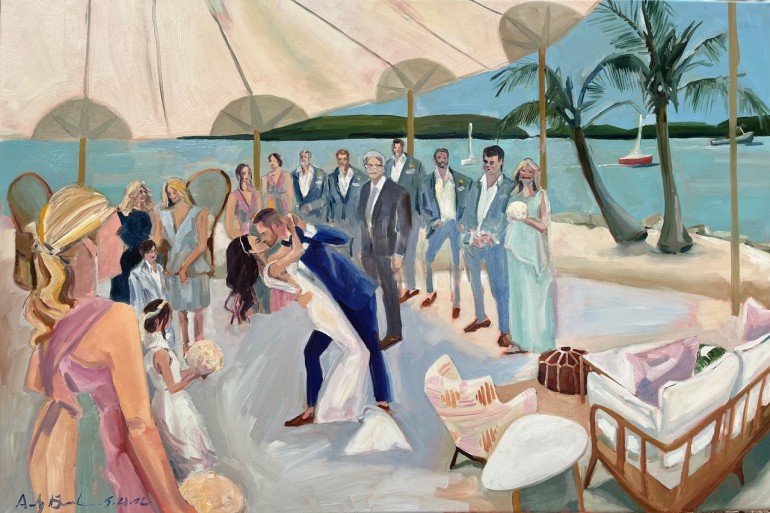 While each of these souvenirs are as pragmatic as they are poignant, there’s another service in which couples can commission a keepsake that fully captures the emotional core of the day, by preserving a meaningful moment in a newlywed’s journey with nothing but paint and a blank canvas full of possibilities.