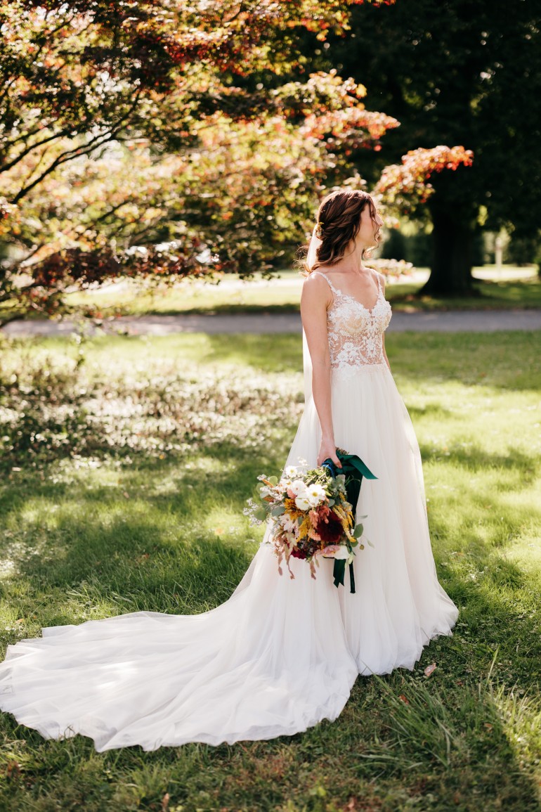 A-Line: Possibly the most popular style on our list due to its forgiving shape and overall comfort, A-line gowns flow from the neckline down to a full skirt. For a more fitted style throughout the bodice, but still creating that “A” shaped silhouette, look for a modified A-line.
