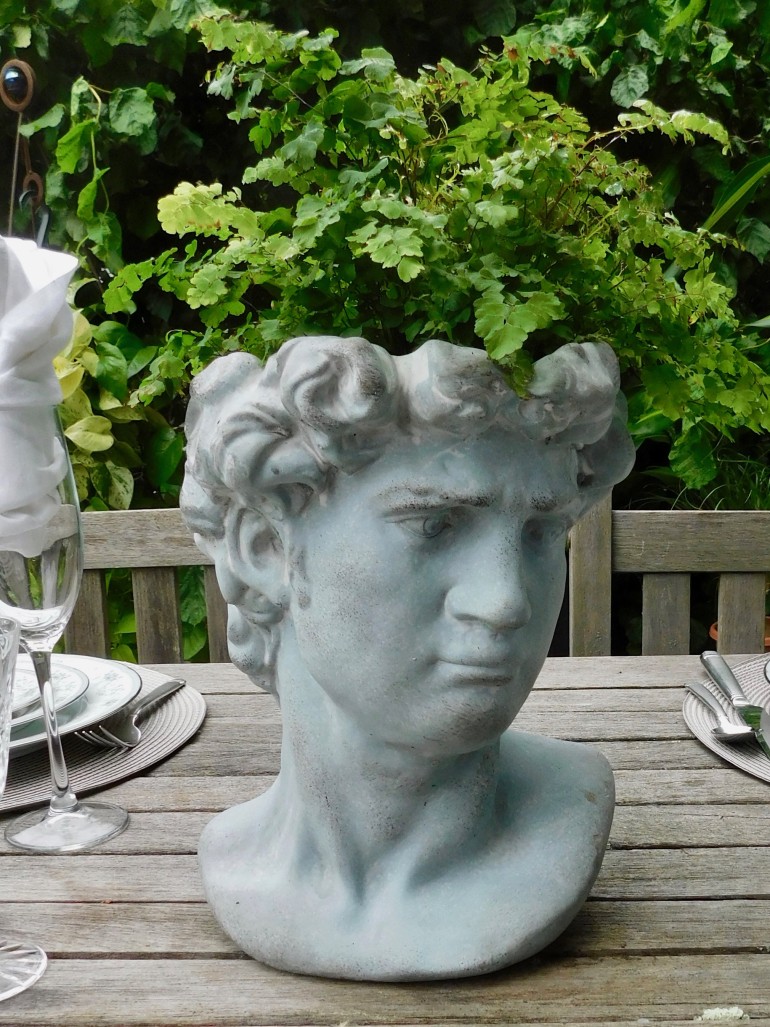 Everyone has a friend or a relative who is a collector. For this table, we borrowed the blue willow collection of Jane Meleady, who has been collecting this china for more than 40 years. The contrast of cobalt blue and white makes a bold statement. You could add silver or pewter pieces easily to this for even a more formal look. Look around the yard for decorative pieces like metal tables or sculptures, pillars and of course plants and flowers. Arrange throughout the yard to give some borders to your outside room. Your mom or grandmother would love to see you using their china, and if there is not enough, you could even mix and match several different patterns that use the same colors or even different colors, borrowing from several different family members.
