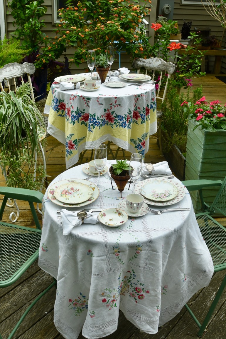 Speaking of mix-and-match, the bohemian look is one of my personal favorites. This makes a great summer look, and it is easy to find mix-and-match pieces at yard sales, thrift shops and antiques stores. For these tables, we used vintage tablecloths and a variety of pink dishes. Potted plants make an excellent backdrop, instead of just the side of the house. You can mix and match silverware, chairs, linens and glassware, but keep to the same color combination, whether it is pastels or more formal pieces. I have also used vintage tablecloths to create sections or dividers in the yard, just by using clothespins to hang them from tree branches. You could also use shepherd hooks to hang them, maybe adding some white or Edison lights.