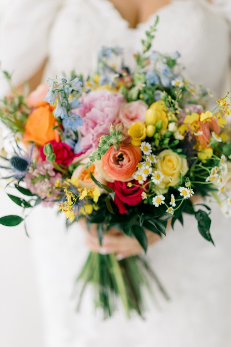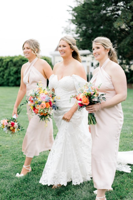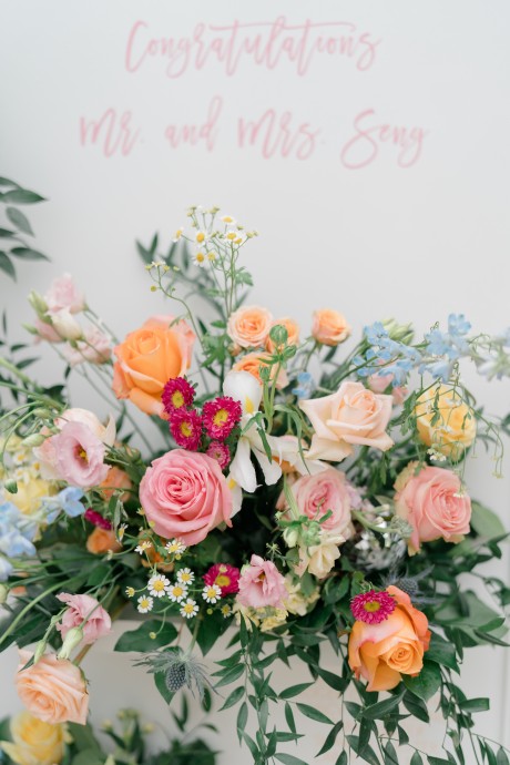 Colors: Soft pink, peach, buttery yellow with pops of periwinkle and red.