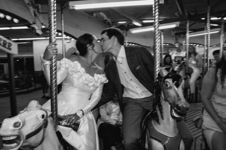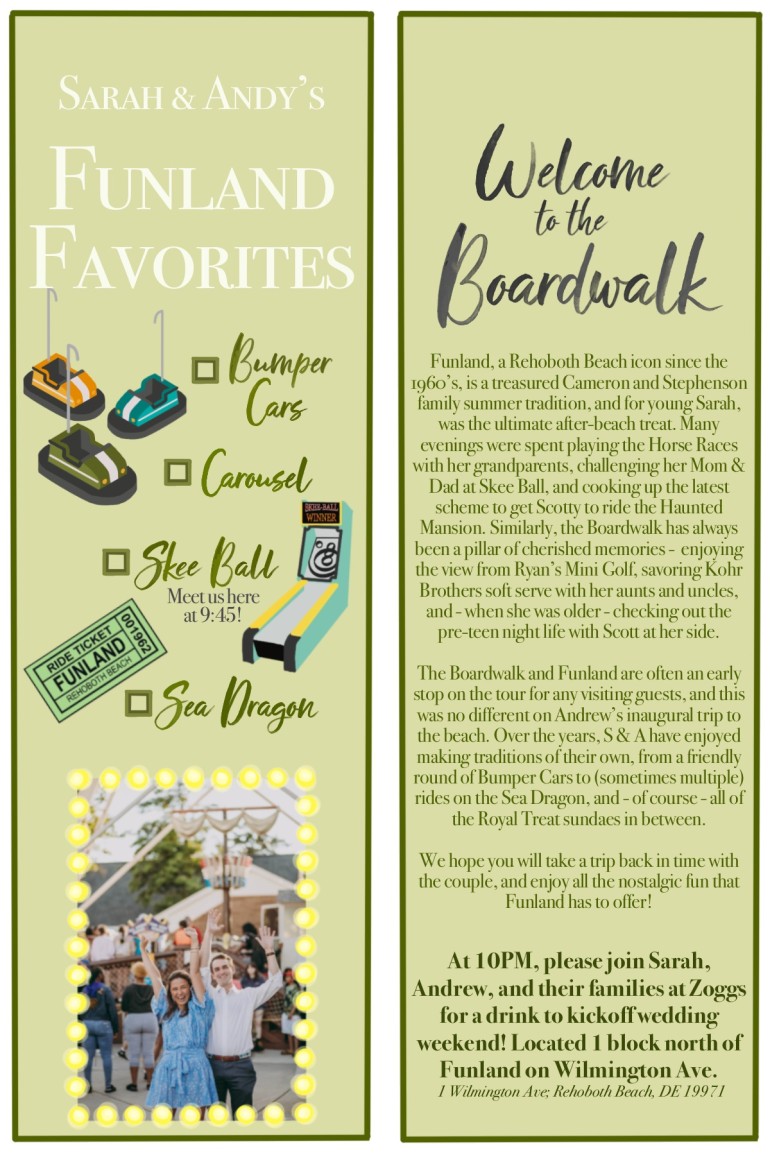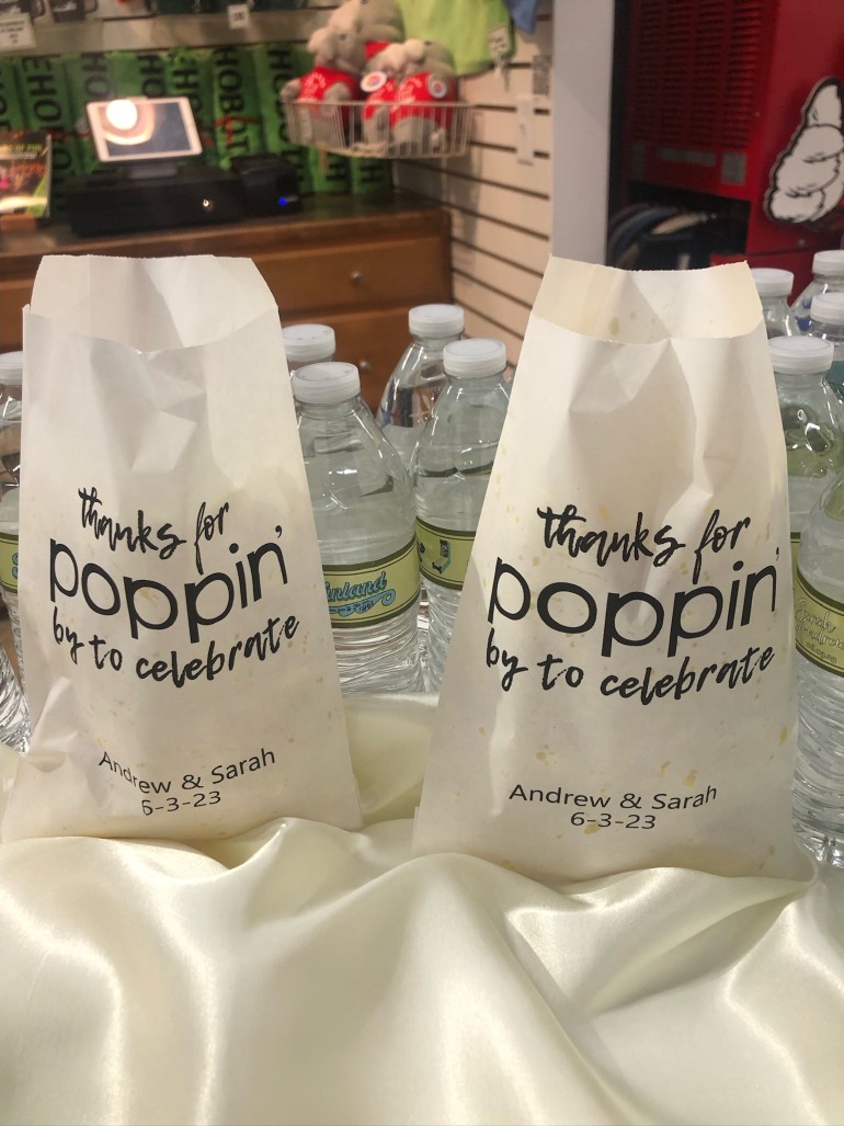 Following the rehearsal dinner Friday evening, the Welcome Party took place at Funland, so Sarah and Andrew could show their friends what they consider “the world’s most wonderful amusement park.” They handed out bookmarks with their story of Funland and their favorite rides, water bottles with personalized labels, and bags of popcorn.