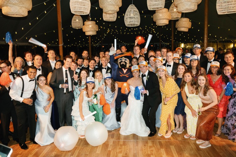 A stunning highlight of their wedding was the three-tier vanilla and buttercream wedding cake, baked and decorated by Rehoboth Beach Country Club’s new pastry chef, which was covered with a colorful variety of individual stemmed flowers and was devoured by guests. Late-night Grotto pizza was passed to guests as they worked up second appetites on the dance floor. To ramp up festivities, orange & blue light-up Pom Poms, glowing spirit sticks, blinking beach balls, and hats printed with “Virginia is for Lovers” were handed out to the guests.