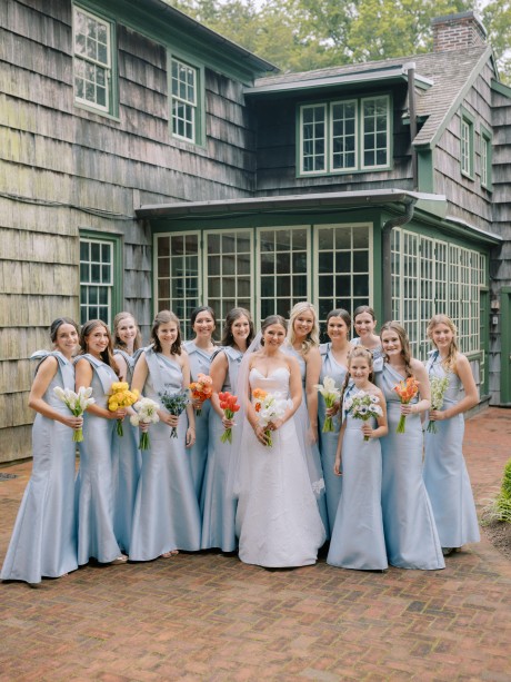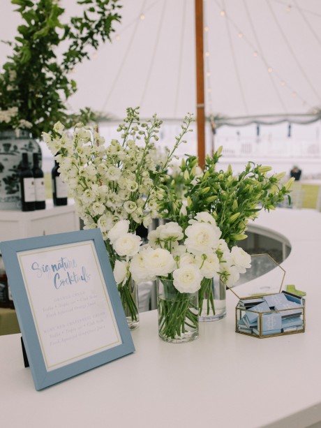 At the end of the reception, Andrew and Sarah exited through a tunnel of waving, light blue ribbon wands, as a trumpeter led the two out to the tune of “All You Need is Love” by the Beatles. Shuttles then took guests to meet the newlyweds at the Rusty Rudder for ongoing celebration!