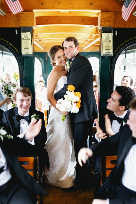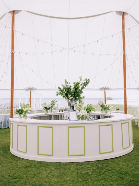 “By the time the marriage ceremony started at 4 pm on Saturday in the packed “Little Church by the Sea,” Westminster Presbyterian Church, the wind was gusting to 40 mph. This was a challenge but made for some epic photos, captured by the talented Mark Boatright.” Afterward, the iconic Jolley Trolley transported the wedding party to the Rehoboth Beach Country Club for cocktail hour and a tented reception. The cocktail hour, in the upstairs ballroom and balcony, overlooked Rehoboth Bay. Even though howling winds them to put down the sides of the fabulous cloth tent for the reception, it was everything Sarah and Andrew dreamed of. “Inside [there was] a gorgeous 16’ circular bar, custom built to match the greens and blues of our palette, displayed an array of beverages with florals, custom matchbooks, and personalized frosted cups flanking each side.” Guests danced all night long to the music of the Dexter Lake Club Band. The Bride and Groom chose to dance their first dance to the song “Best Friend” by Queen. The father/daughter dance was a mix of 4 songs: “Here, There and Everywhere” by The Beatles, “What is Love” by Haddaway, “Never Gonna Give You Up” by Rick Astley, and “Isn’t She Lovely” by Stevie Wonder.